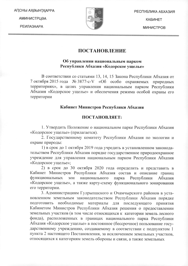 Постановление Кабинета Министров Республики Абхазия от 26.07.2019 №114 "Об управлении национальным парком Республики Абхазия <Кодорское ущелье>"