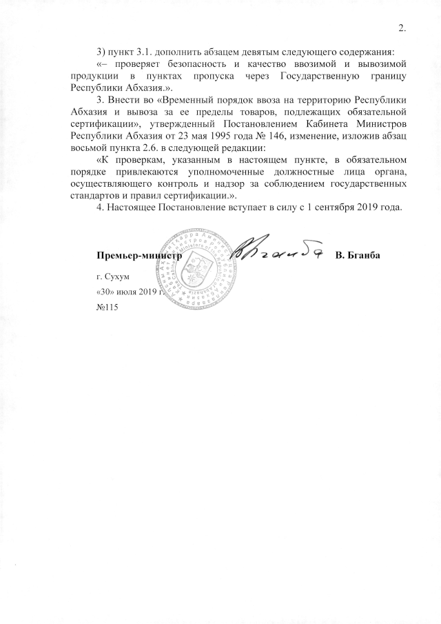 Постановление Кабинета Министров Республики Абхазия от 30.07.2019 №115 "О внесении изменений в некоторые акты Кабинета Министров Республики Абхазия в части осуществления государственного надзора (контроля) за соблюдением обязательных требований государственных стандартов и правил обязательной сертификации в пунктах пропуска через государственную границу Республики Абхазия"