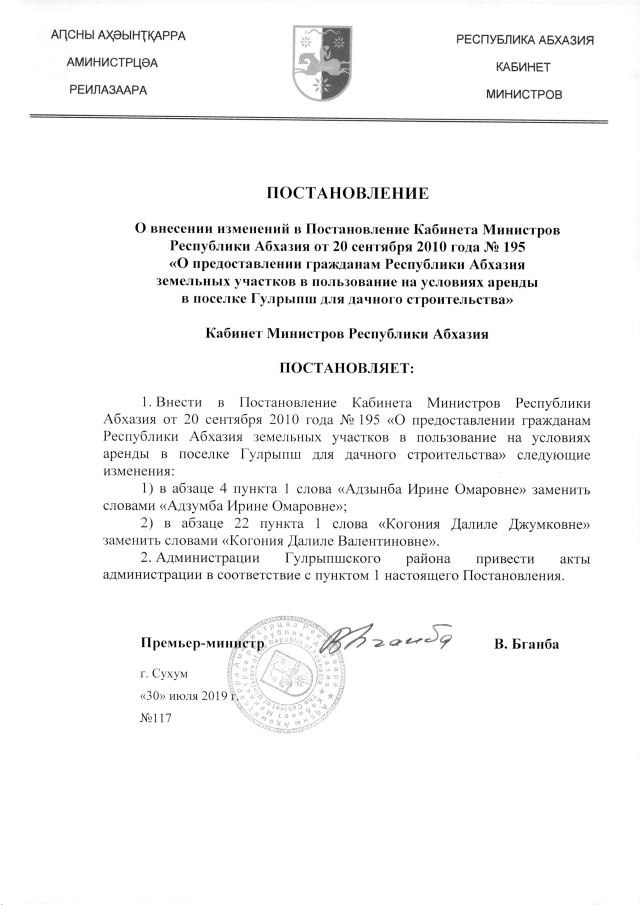 Постановление Кабинета Министров Республики Абхазия от 30.07.2019 №117 "О внесении изменений в Постановление Кабинета Министров Республики Абхазия от 20 сентября 2010 года № 195 <О предоставлении гражданам Республики Абхазия земельных участков в пользование на условиях аренды в поселке Гулрыпш для дачного строительства"