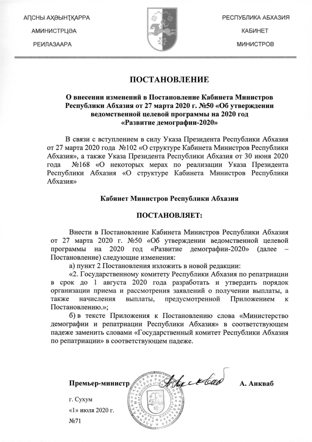 Постановление Кабинета Министров Республики Абхазия от 01.07.2020 №71 "Развитие демографии-2020"