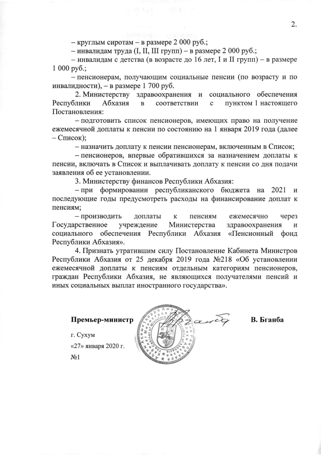 Постановление Кабинета Министров Республики Абхазия от 27.01.2020 №1 "Об установлении ежемесячной доплаты к пенсиям отдельным категориям пенсионеров, граждан Республики Абхазия, не являющихся получателями пенсий и иных социальных выплат иностранного государства"