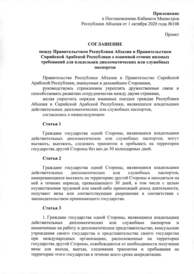 Постановление Кабинета Министров Республики Абхазия от 01.10.2020 №108 "О заключении Соглашения между Правительством Республики Абхазия и Правительством Сирийской Арабской Республики о взаимной отмене визовых требований для владельцев дипломатических или служебных паспортов"