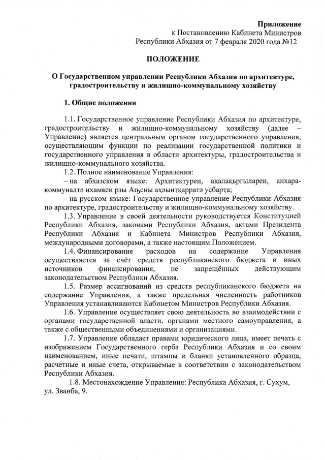 Постановление Кабинета Министров Республики Абхазия от 07.02.2020 №12 "Об утверждении Положения о Государственном управлении Республики Абхазия по архитектуре, градостроительству и жилищно-коммунальному хозяйству"