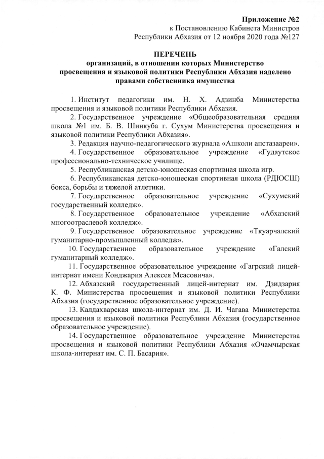 Постановление Кабинета Министров Республики Абхазия от 12.11.2020 №127 "Об утверждении Положения о Министерстве просвещения и языковой политики Республики Абхазия"