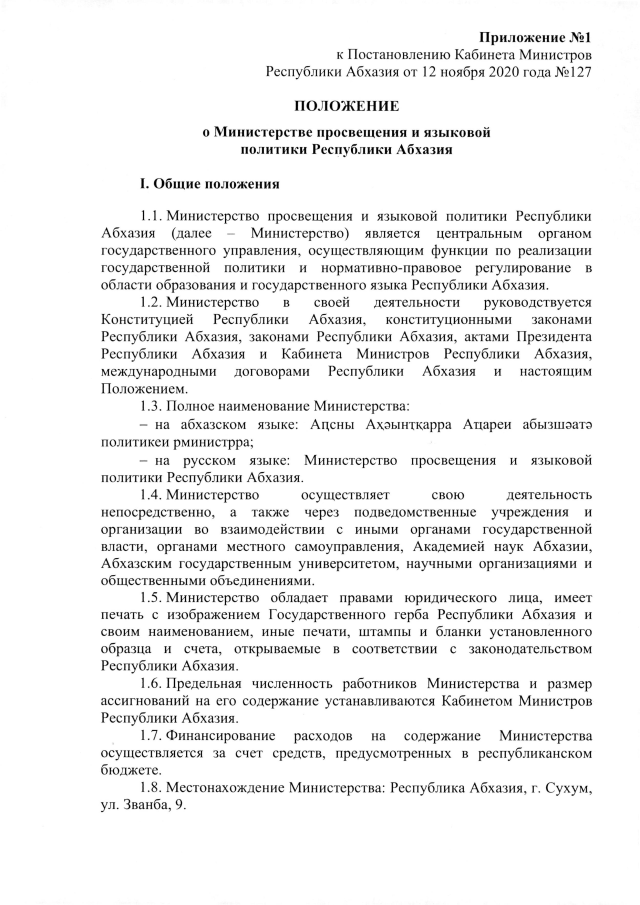 Постановление Кабинета Министров Республики Абхазия от 12.11.2020 №127 "Об утверждении Положения о Министерстве просвещения и языковой политики Республики Абхазия"