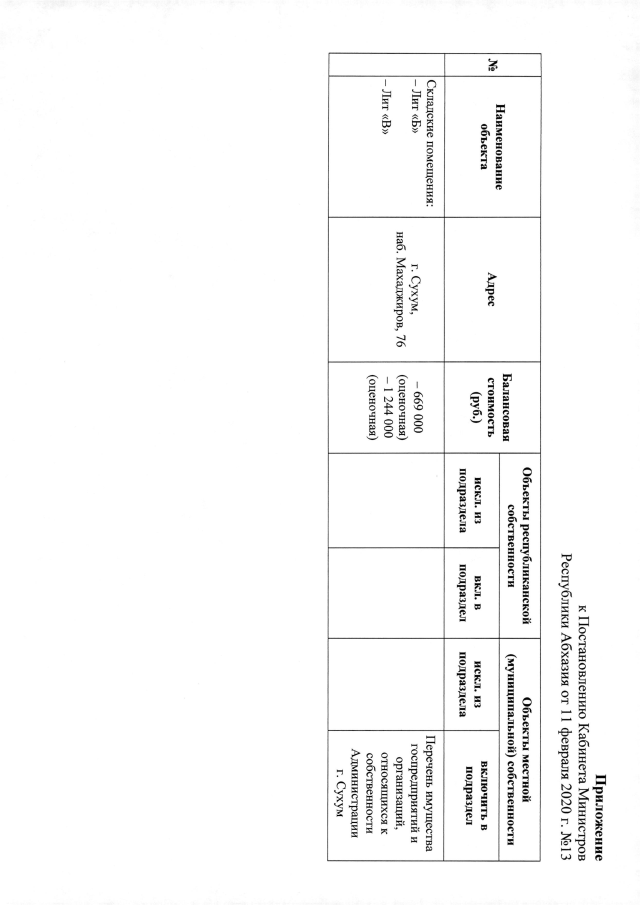 Постановление Кабинета Министров Республики Абхазия от 11.02.2020 №13 "О внесении изменений в Постановление Кабинета Министров Республики Абхазия от 6 июня 2002 года №117 <0 порядке оформления разграничения государственной собственности и формирования Реестра собственности>"