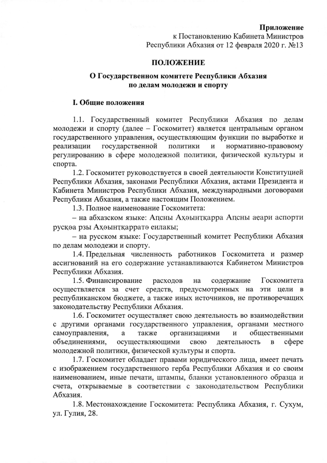 Постановление Кабинета Министров Республики Абхазия от 12.02.2020 №14 "Об утверждении <Положения о Государственном комитете Республики Абхазия по делам молодежи и спорту>"