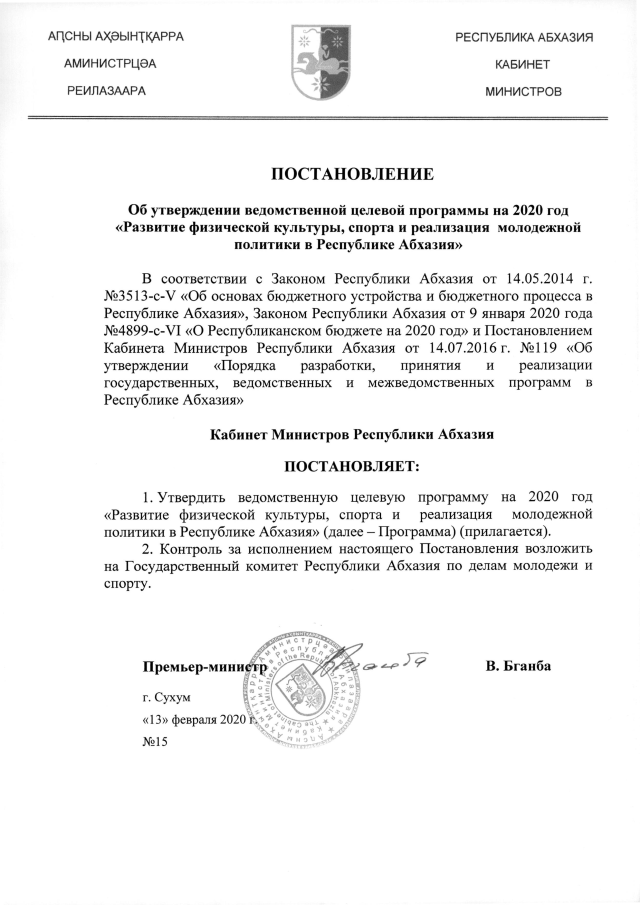 Постановление Кабинета Министров Республики Абхазия от 13.02.2020 №15 "Об утверждении ведомственной целевой программы на 2020 год <Развитие физической культуры, спорта и реализация молодежной политики в Республике Абхазия>"