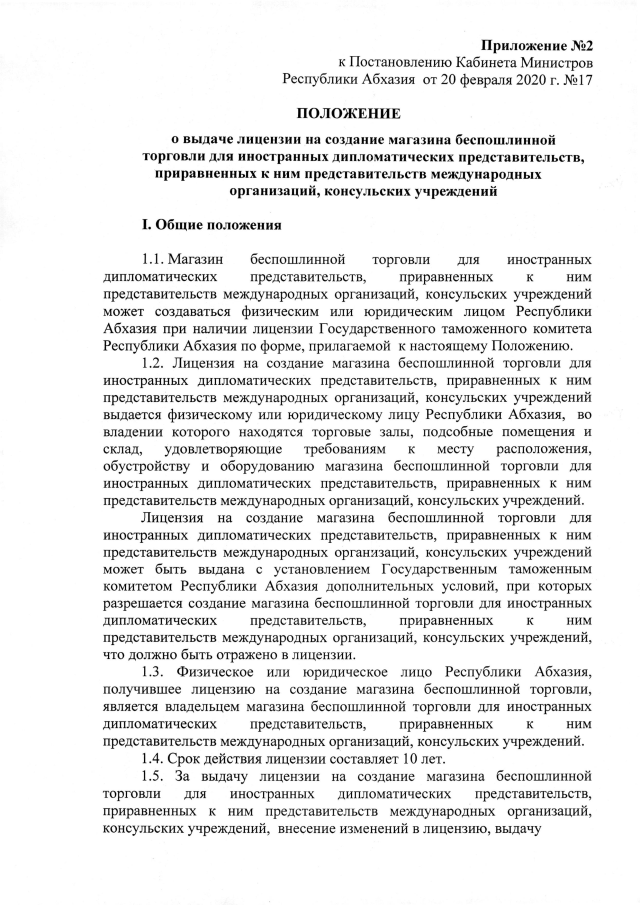 Постановление Кабинета Министров Республики Абхазия от 20.02.2020 №17 "Об утверждении Порядка выдачи лицензии и Положения о выдаче лицензии на создание магазина беспошлинной торговли для иностранных дипломатических представительств, приравненных к ним представительств международных организаций, консульских учреждений"
