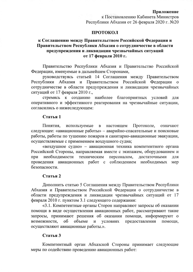 Постановление Кабинета Министров Республики Абхазия от 26.02.2020 №20 "О проекте Протокола к Соглашению между Правительством Республики Абхазия и Правительством Российской Федерации о сотрудничестве в области предупреждения и ликвидации чрезвычайных ситуаций от 17 февраля 2010 года"