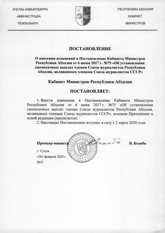 Постановление Кабинета Министров Республики Абхазия от 26.02.2020 №23 "О внесении изменений в Постановление Кабинета Министров Республики Абхазия от 6 июня 2017 г. №75 "Об установлении ежемесячных выплат членам Союза журналистов Республики Абхазия, являвшимся членами Союза журналистов СССР""