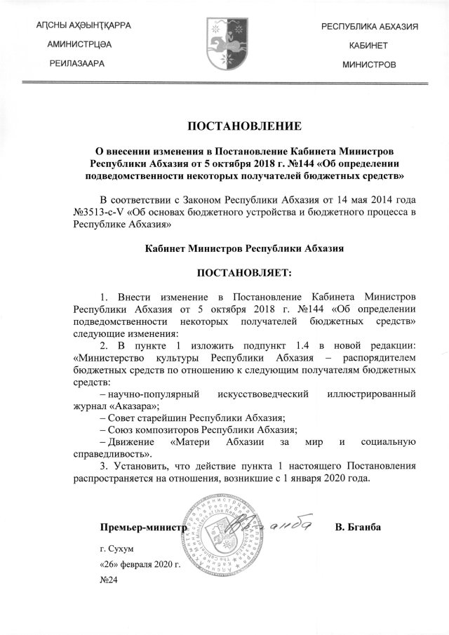 Постановление Кабинета Министров Республики Абхазия от 26.02.2020 №24 "О внесении изменения в Постановление Кабинета Министров Республики Абхазия от 5 октября 2018 г. №144 "Об определении подведомственности некоторых получателей бюджетных средств""