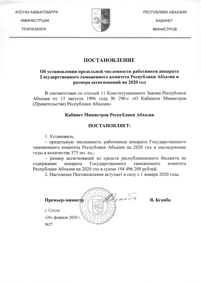 Постановление Кабинета Министров Республики Абхазия от 26.02.2020 №27 "Об установлении предельной численности работников аппарата Государственного таможенного комитета Республики Абхазия и размера ассигнований на 2020 год"