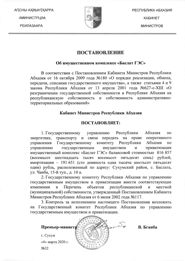 Постановление Кабинета Министров Республики Абхазия от 04.03.2020 №32 "Об имущественном комплексе "Баслат ГЭС""