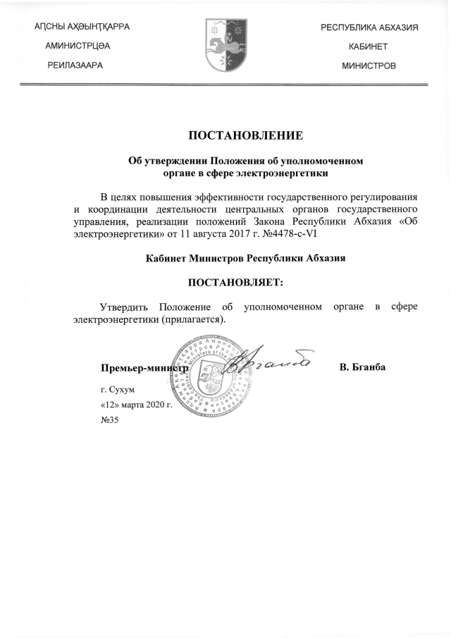 Постановление Кабинета Министров Республики Абхазия от 12.03.2020 №35 "Об утверждении Положения об уполномоченном органе в сфере электроэнергетики"