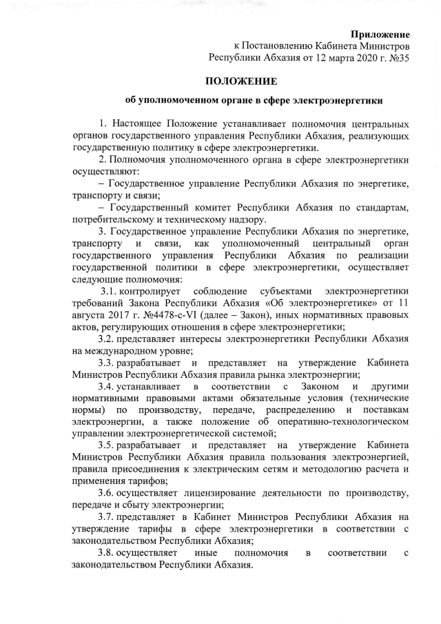 Постановление Кабинета Министров Республики Абхазия от 12.03.2020 №35 "Об утверждении Положения об уполномоченном органе в сфере электроэнергетики"