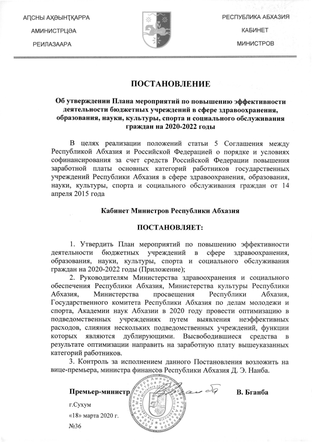 Постановление Кабинета Министров Республики Абхазия от 18.03.2020 №36 "Об утверждении Плана мероприятий по повышению эффективности деятельности бюджетных учреждений в сфере здравоохранения, образования, науки, культуры, спорта и социального обслуживания граждан на 2020-2022 годы"