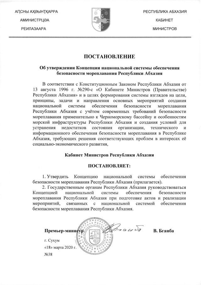 Постановление Кабинета Министров Республики Абхазия от 18.03.2020 №38 "Об утверждении Концепции национальной системы обеспечения безопасности мореплавания Республики Абхазия"