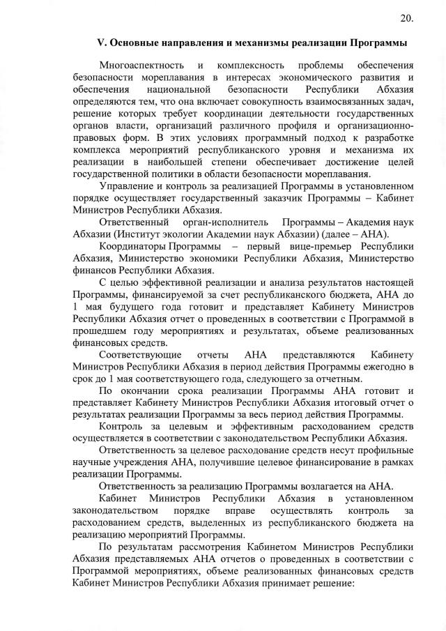 Постановление Кабинета Министров Республики Абхазия от 18.03.2020 №39 "Об утверждении межведомственной целевой программы на 2020-2024 годы "Создание национальной системы обеспечения безопасности мореплавания Республики Абхазия""