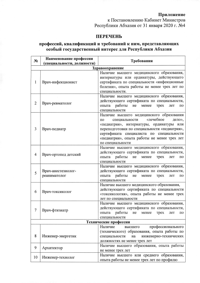 Постановление Кабинета Министров Республики Абхазия от 31.01.2020 №4 "Об утверждении перечня профессий, квалификаций и требований к ним, представляющих особый государственный интерес для Республики Абхазия"