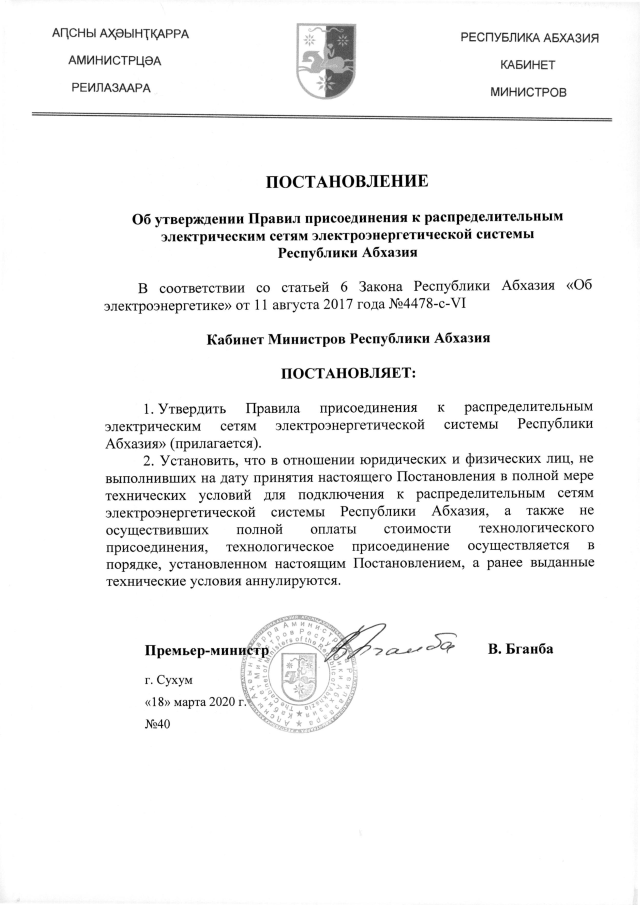 Постановление Кабинета Министров Республики Абхазия от 18.03.2020 №40 "Об утверждении Правил присоединения к распределительным электрическим сетям электроэнергетической системы Республики Абхазия"