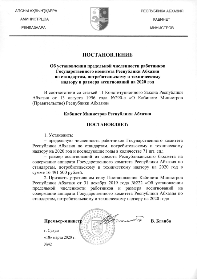 Постановление Кабинета Министров Республики Абхазия от 18.03.2020 №42 "Об установлении предельной численности работников Государственного комитета Республики Абхазия по стандартам, потребительскому и техническому надзору и размера ассигнований на 2020 год"