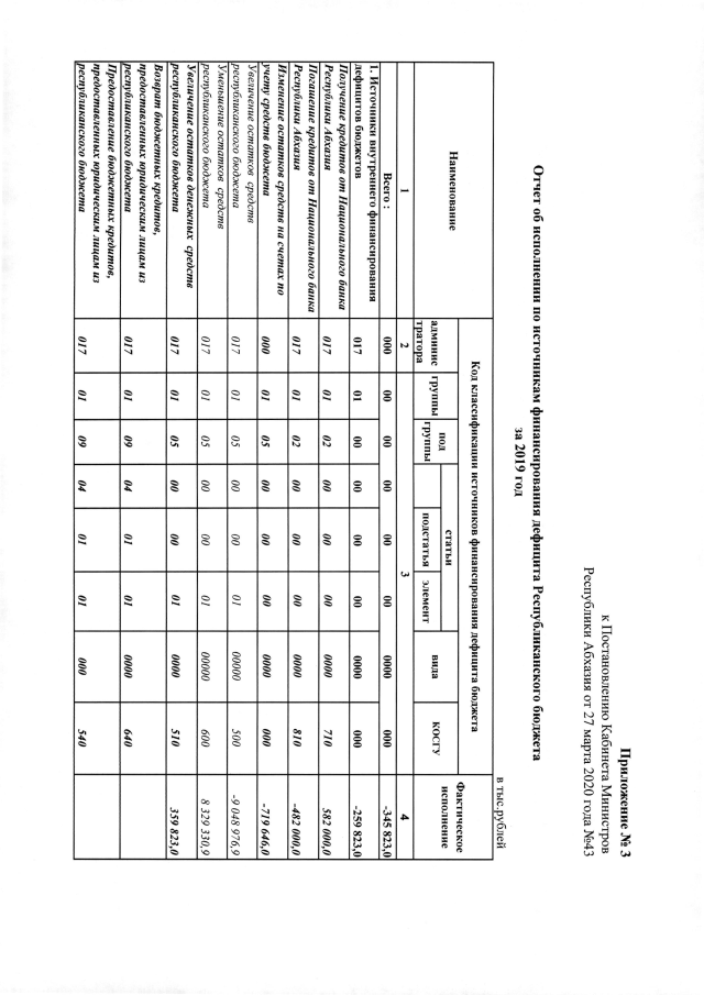 Постановление Кабинета Министров Республики Абхазия от 27.03.2020 №43 "Об исполнении республиканского бюджета за 2019 год"
