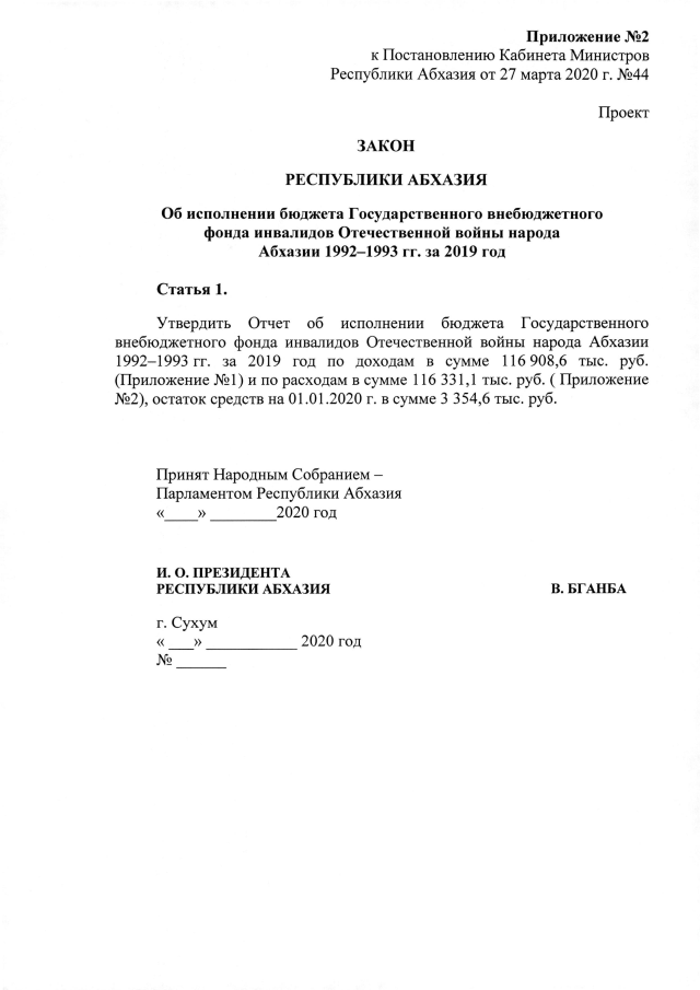 Постановление Кабинета Министров Республики Абхазия от 27.03.2020 №44 "Об исполнении бюджета Государственного внебюджетного фонда инвалидов Отечественной войны народа Абхазии 1992-1993 гг. за 2019 год"
