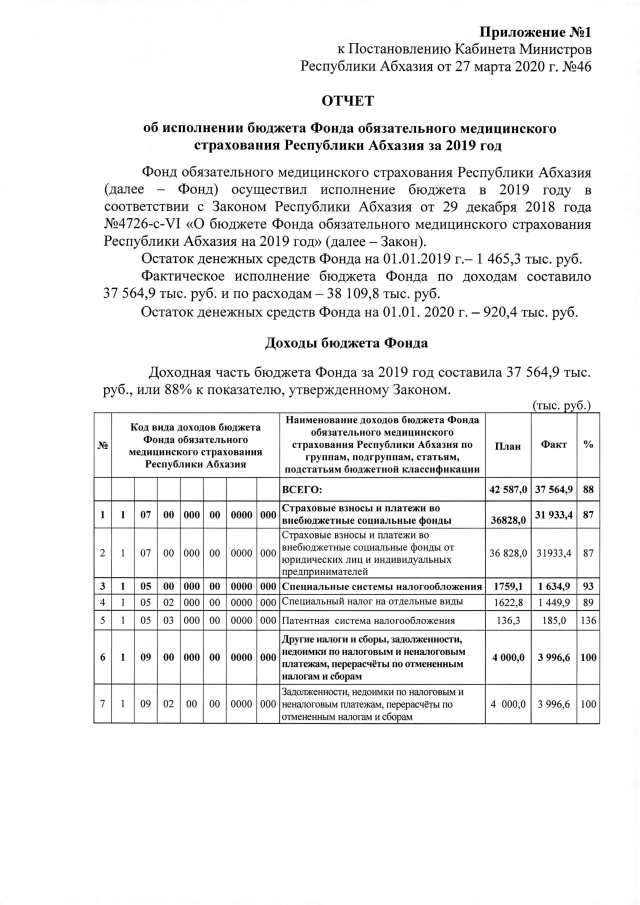 Постановление Кабинета Министров Республики Абхазия от 27.03.2020 №46 "Об исполнении бюджета Фонда обязательного медицинского страхования Республики Абхазия за 2019 год"