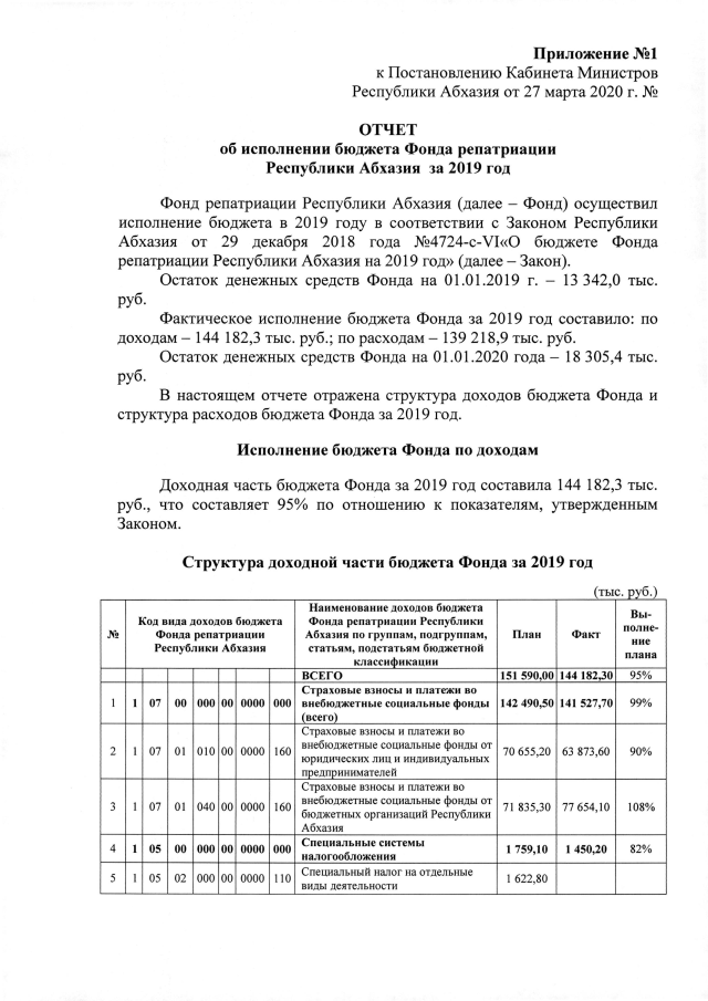 Постановление Кабинета Министров Республики Абхазия от 27.03.2020 №49 "Об исполнении бюджета Фонда репатриации Республики Абхазия за 2019 год"