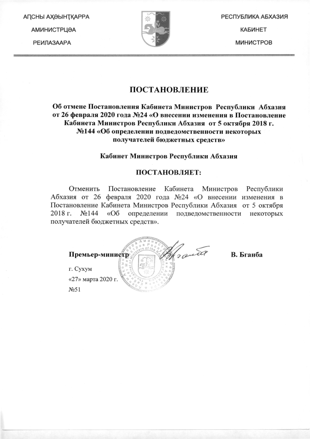 Постановление Кабинета Министров Республики Абхазия от 27.03.2020 №51 "Об отмене Постановления Кабинета Министров Республики Абхазия от 26 февраля 2020 года №24 "О внесении изменения в Постановление Кабинета Министров Республики Абхазия от 5 октября 2018 г. №144 "Об определении подведомственности некоторых получателей бюджетных средств""