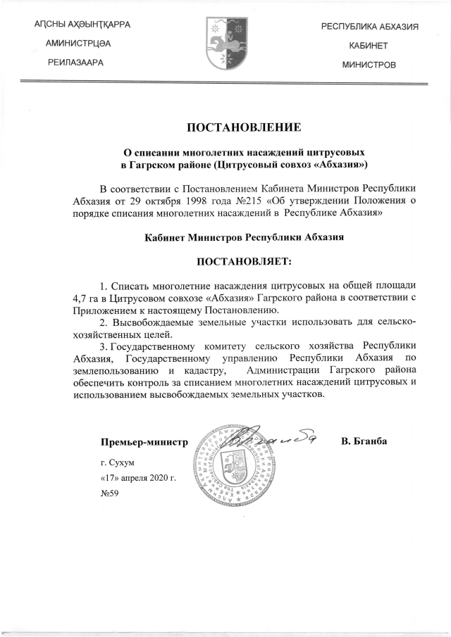 Постановление Кабинета Министров Республики Абхазия от 17.04.2020 №59 "О списании многолетних насаждений цитрусовых в Гагрском районе (Цитрусовый совхоз "Абхазия")"