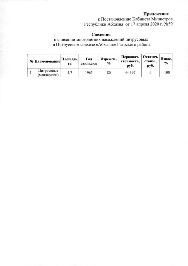 Постановление Кабинета Министров Республики Абхазия от 17.04.2020 №59 "О списании многолетних насаждений цитрусовых в Гагрском районе (Цитрусовый совхоз "Абхазия")"