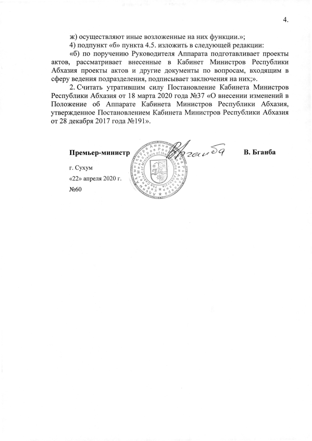 Постановление Кабинета Министров Республики Абхазия от 22.04.2020 №60 "О внесении изменений в Положение об Аппарате Кабинета Министров Республики Абхазия, утвержденное Постановлением Кабинета Министров Республики Абхазия от 28 декабря 2017 года №191"