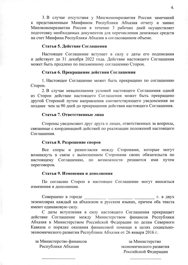 Постановление Кабинета Министров Республики Абхазия от 22.04.2020 №61 "Об одобрении проекта Соглашения между Министерством финансов Республики Абхазия и Министерством экономического развития Российской Федерации о порядке оказания финансовой помощи Республике Абхазия в целях осуществления бюджетных инвестиций и поддержки инвестиционной деятельности и проекта Соглашения между Министерством финансов Республики Абхазия и Министерством экономического развития Российской Федерации о порядке оказания финансовой помощи в целях социально-экономического развития Республики Абхазия "
