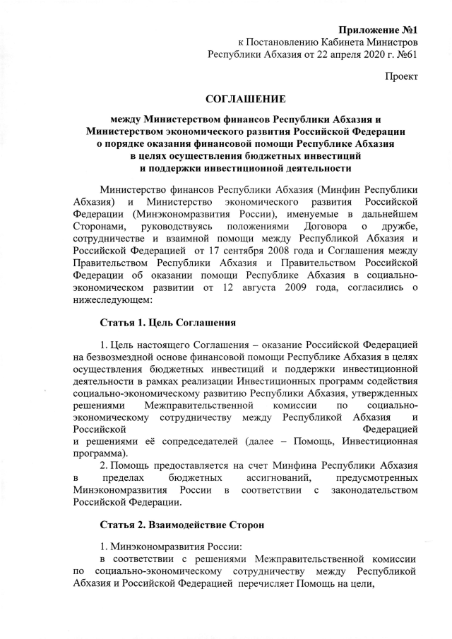 Постановление Кабинета Министров Республики Абхазия от 22.04.2020 №61 "Об одобрении проекта Соглашения между Министерством финансов Республики Абхазия и Министерством экономического развития Российской Федерации о порядке оказания финансовой помощи Республике Абхазия в целях осуществления бюджетных инвестиций и поддержки инвестиционной деятельности и проекта Соглашения между Министерством финансов Республики Абхазия и Министерством экономического развития Российской Федерации о порядке оказания финансовой помощи в целях социально-экономического развития Республики Абхазия "
