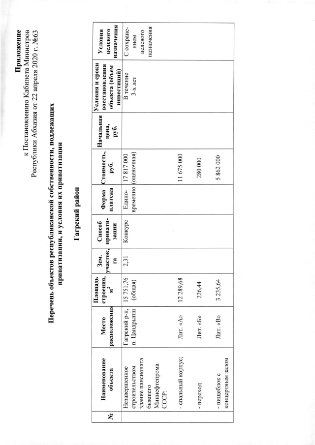 Постановление Кабинета Министров Республики Абхазия от 22.04.2020 №63 "Об установлении Перечня объектов республиканской собственности, подлежащих приватизации, и условий их приватизации"