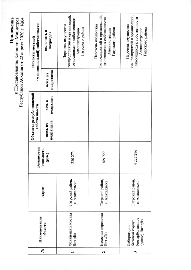 Постановление Кабинета Министров Республики Абхазия от 22.04.2020 №64 "О передаче части площади <"Касатка" ГНУ "СФТИ" Академии наук Абхазии в собственность Администрации Гагрского района"