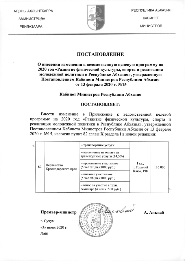Постановление Кабинета Министров Республики Абхазия от 03.06.2020 №66 "О внесении изменения в ведомственную целевую программу на 2020 год "Развитие физической культуры, спорта и реализация молодежной политики в Республике Абхазия", утвержденную Постановлением Кабинета Министров Республики Абхазия от 13 февраля 2020 г. №15"