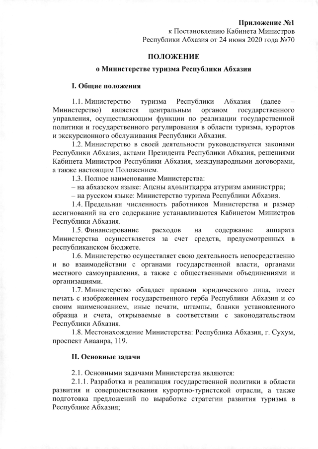 Постановление Кабинета Министров Республики Абхазия от 24.06.2020 №70 "Об утверждении Положения о Министерстве туризма Республики Абхазия"