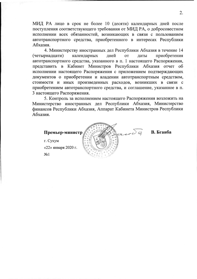 РАСПОРЯЖЕНИЕ Кабинета Министров Республики Абхазия от 22.01.2020 №1 "Об использовании средств резервного фонда Кабинета Министров Республики Абхазия"