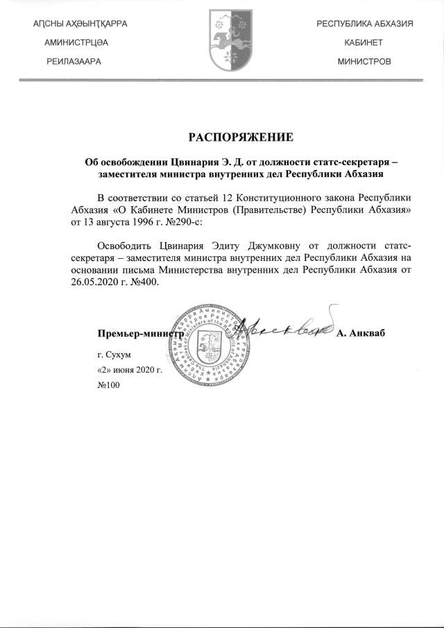 РАСПОРЯЖЕНИЕ Кабинета Министров Республики Абхазия от 02.06.2020 №100 "Об освобождении Цвинария Э.Д. от должности статс-секретаря - заместителя министра внутренних дел Республики Абхазия"