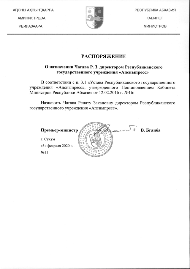 РАСПОРЯЖЕНИЕ Кабинета Министров Республики Абхазия от 03.02.2020 №11 "О назначении Чагава Р. З. директором Республиканского государственного учреждения "Апсныпресс""