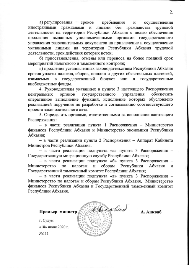 РАСПОРЯЖЕНИЕ Кабинета Министров Республики Абхазия от 18.06.2020 №111 "О порядке реализации поручений Президента Республики Абхазия о мерах поддержки субъектов предпринимательской деятельности в период распространения новой коронавирусной инфекции COVID-19 в Республике Абхазия"