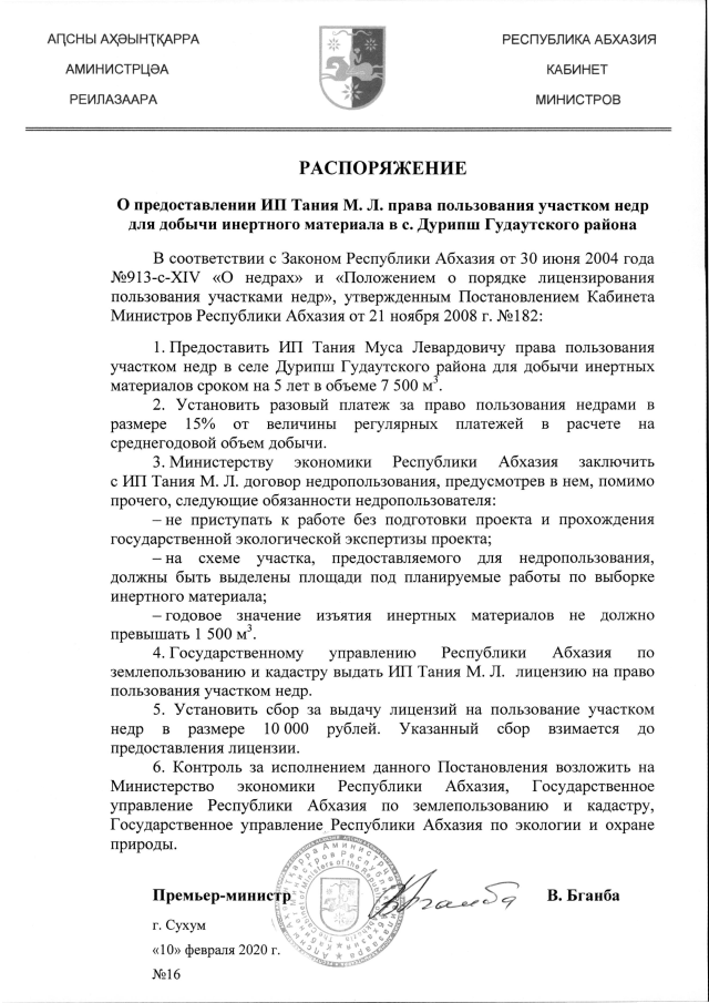 РАСПОРЯЖЕНИЕ Кабинета Министров Республики Абхазия от 10.02.2020 №16 "О предоставлении ИП Тания М. Л. права пользования участком недр для добычи инертного материала в с. Дурипш Гудаутского района"