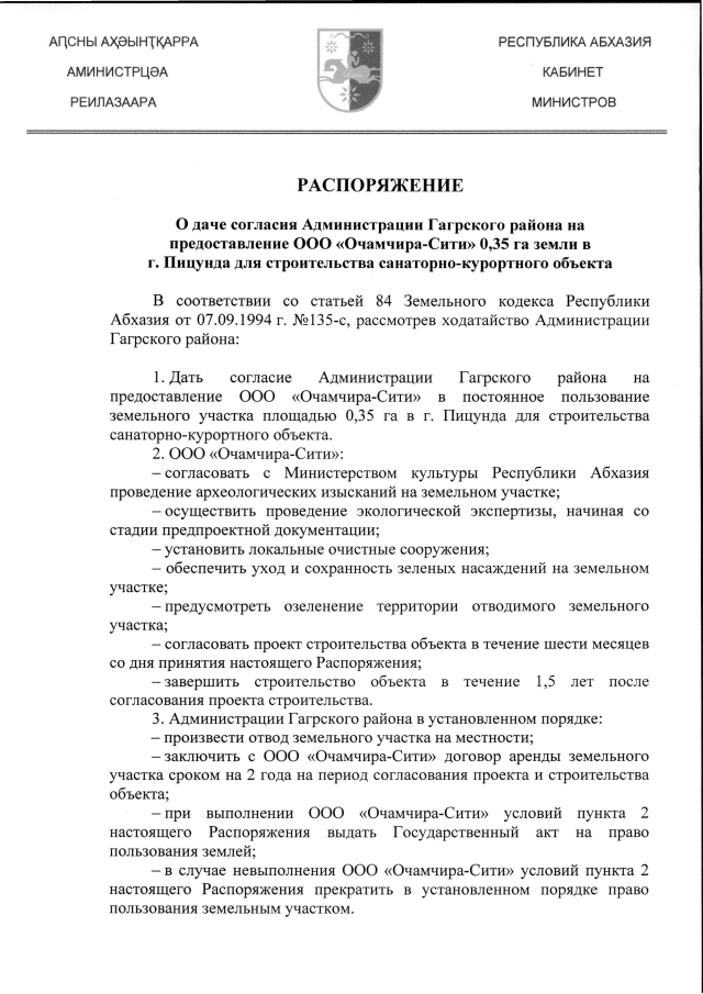РАСПОРЯЖЕНИЕ Кабинета Министров Республики Абхазия от 10.02.2020 №17 "О даче согласия Администрации Гагрского района на предоставление ООО "Очамчира-Сити" 0,35 га земли в г. Пицунда для строительства санаторно-курортного объекта"
