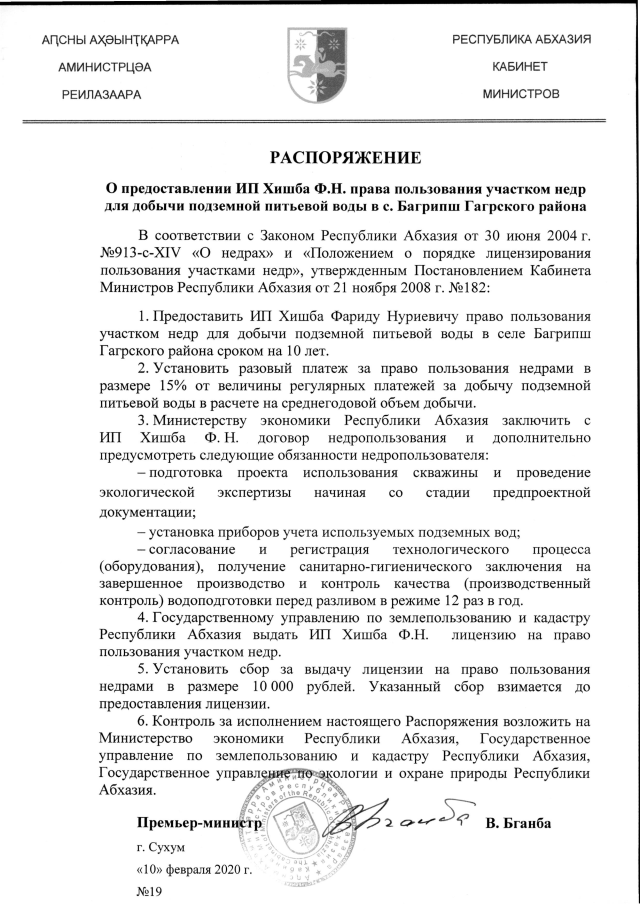 РАСПОРЯЖЕНИЕ Кабинета Министров Республики Абхазия от 10.02.2020 №19 "О предоставлении ИП Хишба Ф.Н. права пользования участком недр для добычи подземной питьевой воды в с. Багрипш Гагрского района"