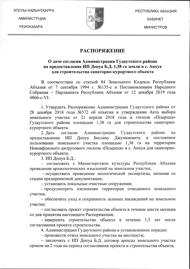 РАСПОРЯЖЕНИЕ Кабинета Министров Республики Абхазия от 10.02.2020 №20 "О даче согласия Администрации Гудаутского района на предоставление ИП Допуа Б.Д. 1,38 га земли в с. Анхуа для строительства санаторно-курортного объекта"