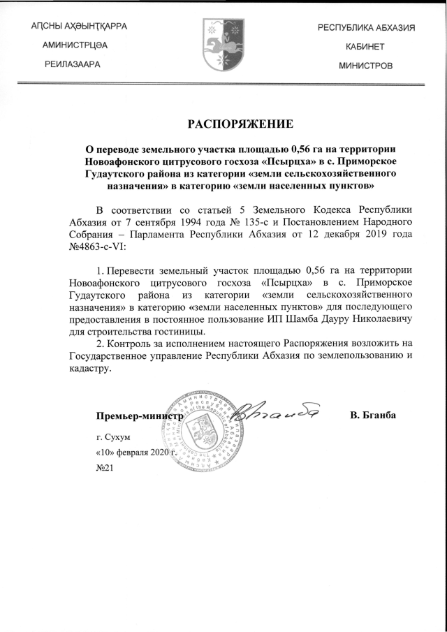 РАСПОРЯЖЕНИЕ Кабинета Министров Республики Абхазия от 10.02.2020 №21 "О переводе земельного участка площадью 0,56 га на территории Новоафонского цитрусового госхоза "Псырцха" в с. Приморское Гудаутского района из категории "земли сельскохозяйственного назначению" в категорию "земли населенных пунктов""