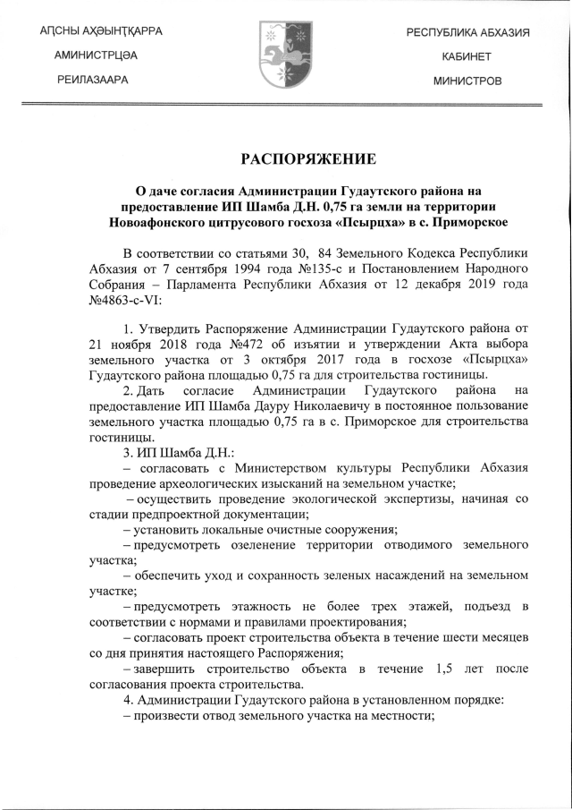 РАСПОРЯЖЕНИЕ Кабинета Министров Республики Абхазия от 10.02.2020 №22 "О даче согласия Администрации Гудаутского района на предоставление ИП Шамба Д.Н. 0,75 га земли на территории Новоафонского цитрусового госхоза "Псырцха" в с. Приморское"